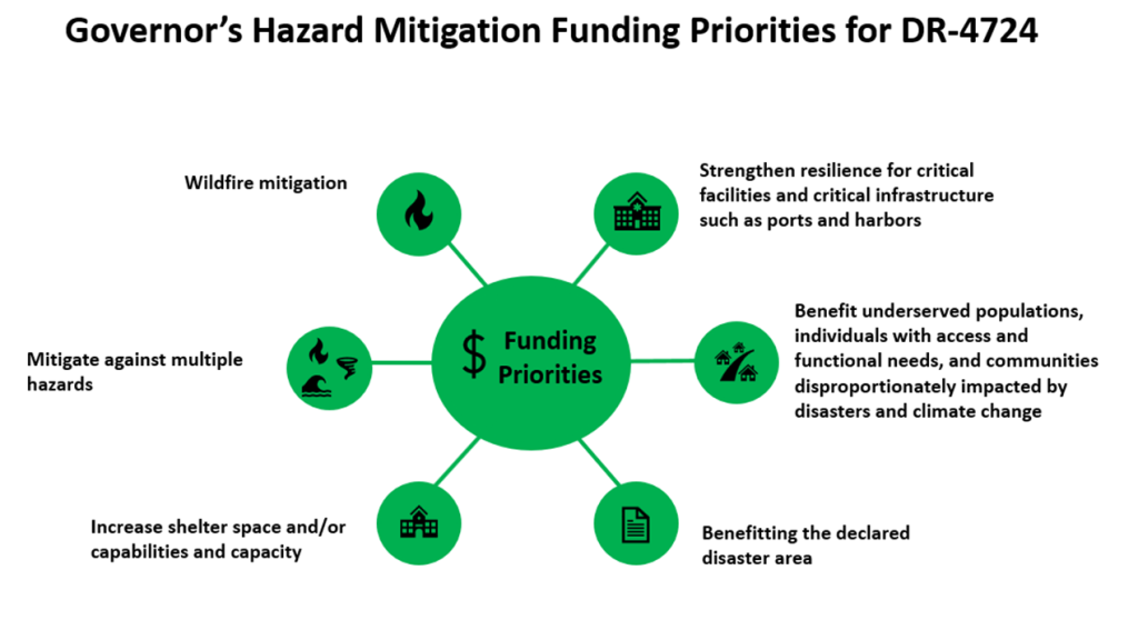 This posted list reflects the priority projects selected for the DR-4724 Hazard Mitigation Grant Program. Ranging from flood mitigation to hardening existing buildings against winds and other hazards, these projects, if approved, will benefit communities throughout Hawaiʻi by reducing risks during emergencies, improving emergency response and preparedness, and increasing community resilience.