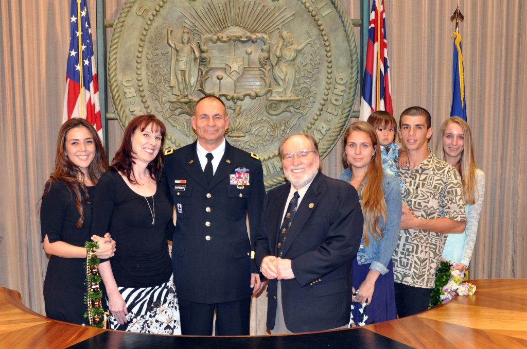 Brigadier General Bryan Suntheimer received his stars in a pinning ceremony in the Governor’s Ceremonial Room on Friday, January 17, 2014.  Doing the honors were Governor Neil Abercrombie and his wife, Marisa Burgess-Suntheimer. The general’s family members, Ashlee, Emily, Tyler and Caitlyn were present for the ceremony. (the child was not identified)