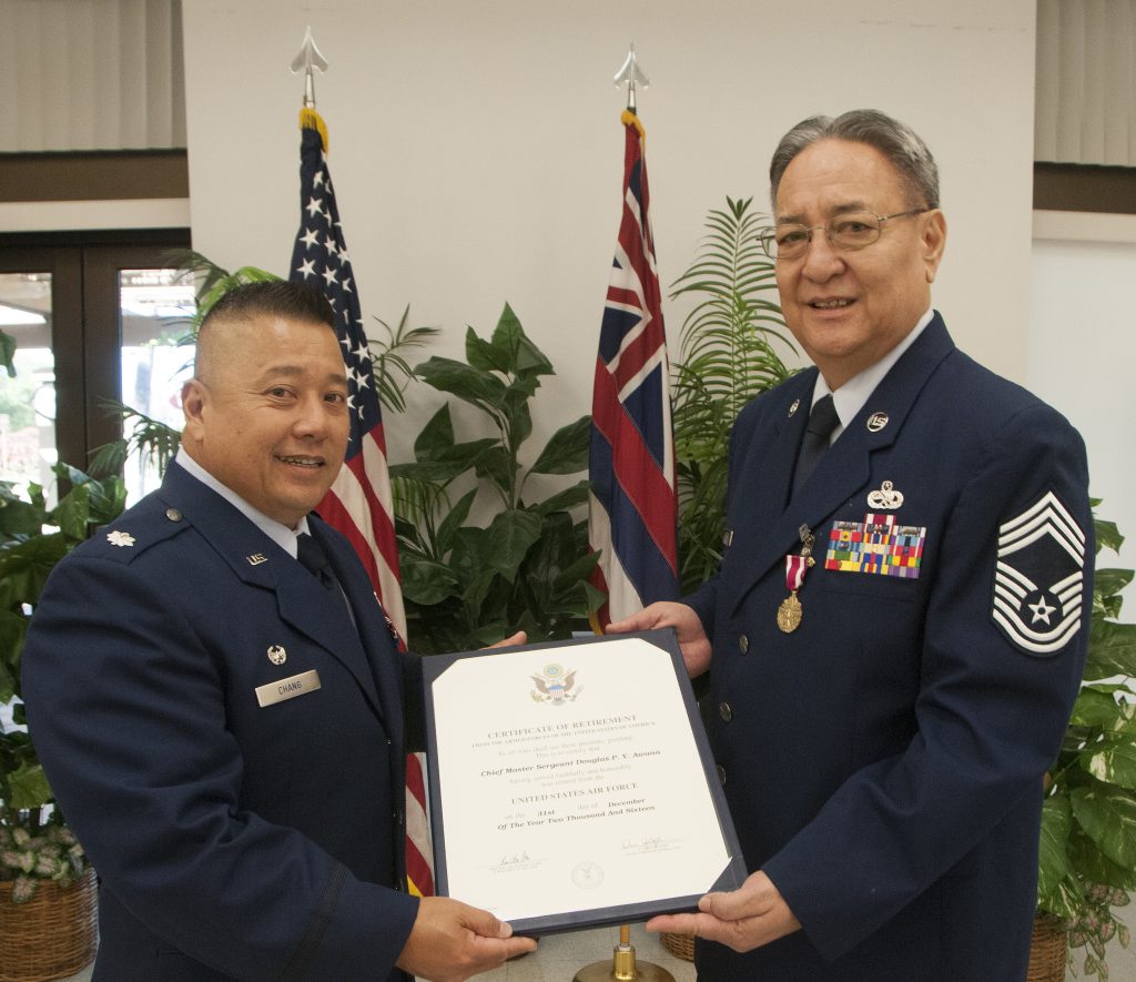 A retirement ceremony for CMSgt Douglas Awana was held on Friday, January 6, 2017. The Chief began his began his military career in March 1975 and retired with 41 years of service to his country and state. Congratulations to Chief Awana!