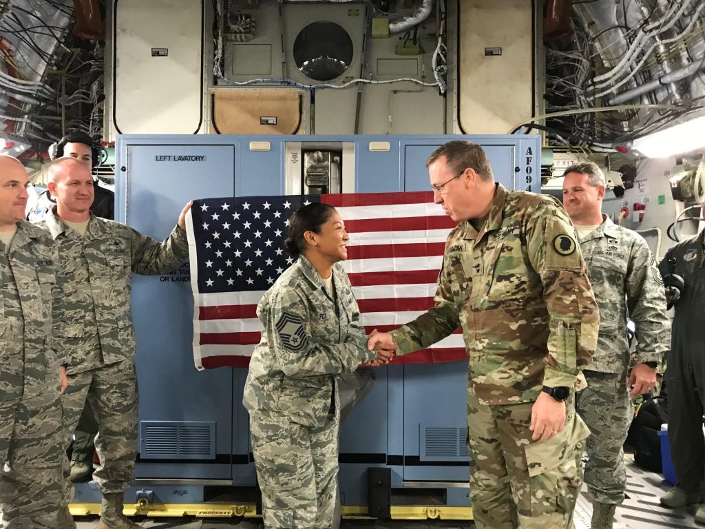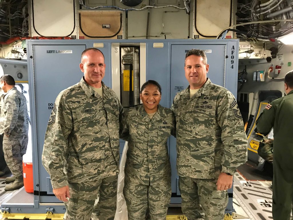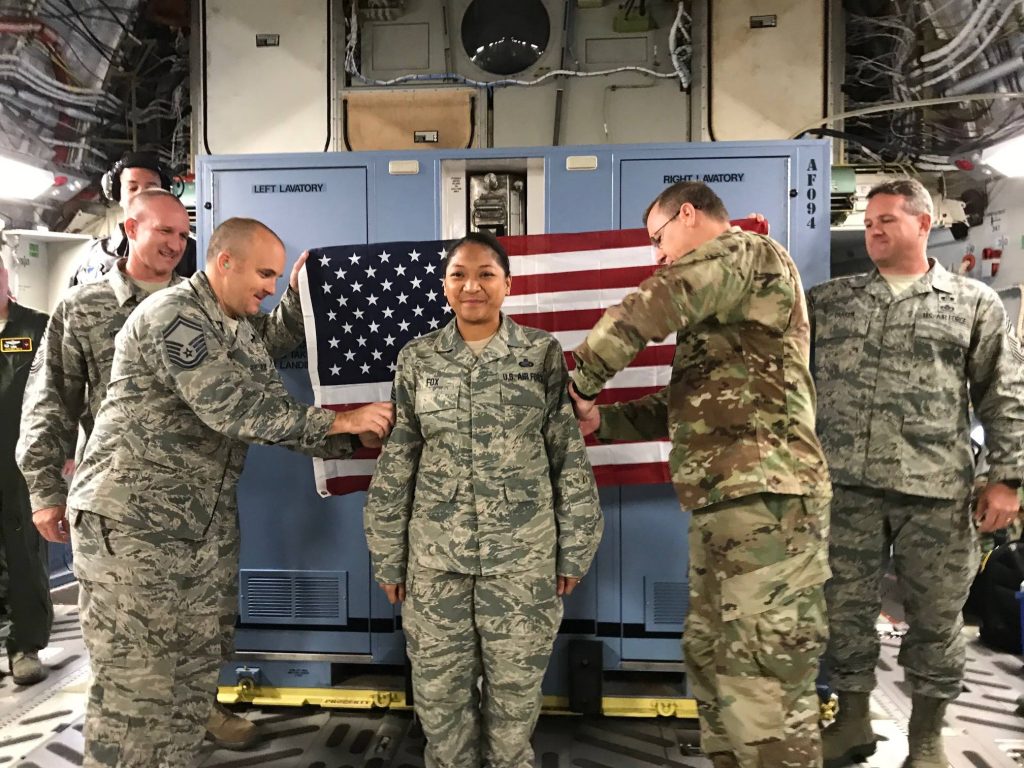 SMSgt Zandra Fox, 154th Force Support Squadron Superintendent is promoted the rank of CMSgt (E-9) on March 1, 2017 on board the Hickam C-17 before departing from Andrews AFB, Maryland headed home to Hickam AFB, Hawaii.
