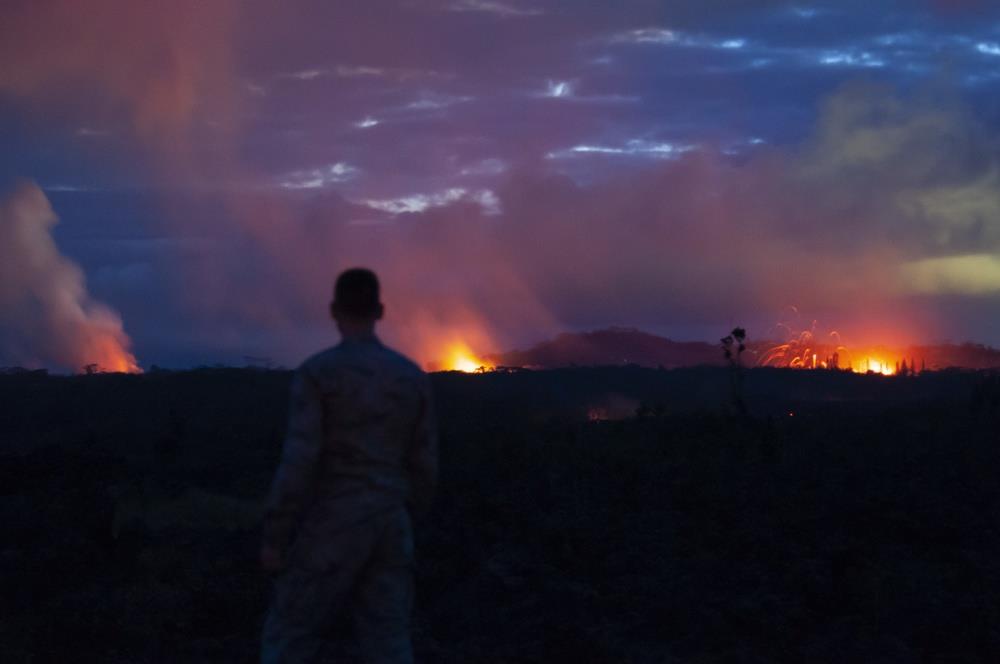 Lava fissure’s erupts at Leilani Estates and Lanipuna Gardens subdivisions, Pahoa, Hawaii on May 15-17, 2018. In response to the ongoing outbreak, more than 100 members of the Hawaii National Guard have been assisting Hawaii County agencies as part of an operation called Task Force Hawaii. The activated guardsmen are providing around-the-clock presence and guidance to evacuees.