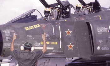 The red stars denote aerial victories credited to that aircraft when it was assigned to a previous squadron during the Vietnam War. One of the credits was for the downing of a Mig-17 using an AIM-9 missile on June 5, 1967 by Capt. Richard M. Pascoe and 1st Lt. Norman E. Wells of the 555th Tactical Fighter Squadron.