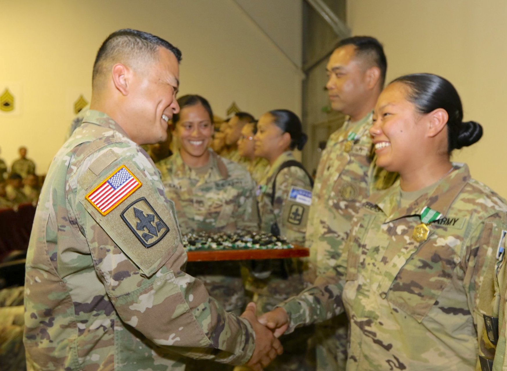 Soldiers of 29th Infantry Brigade Combat Team, Multinational Battle Group-East (MNBG-E), KFOR 25, are awarded end of tour awards July 9, 2019, at Camp Bondsteel, Kosovo.
