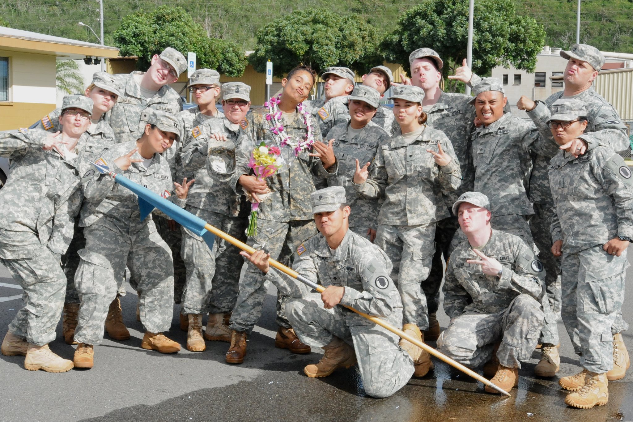 117th Mobile Public Affairs Detachment soldiers gather around Sgt. 1st Class Theresa Gualdarama making their “G” faces in celebration of her promotion here February 7, 2012. (U.S. Army photo) — with Nevada J Smith, Melina M. Juan, Katie Gray, Stephanie Hika, Theresa Gualdarama, Gavin Ching, Ryan Sheldon, Robert Souza III, soua, Stephanie Olina Usita and Jeff Hickman.