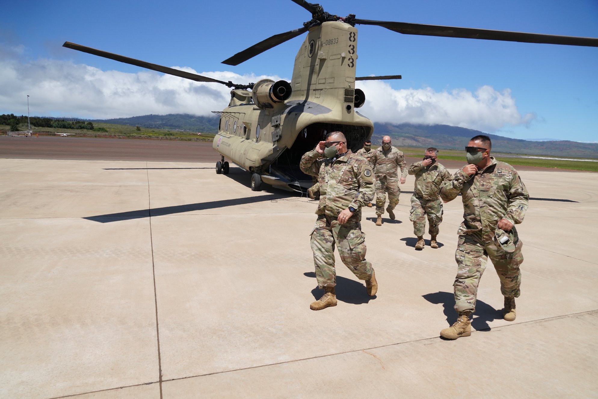 Joint Task Force Commander Brig. Gen. Moses Kaoiwi Jr. and his command team departs a Hawaii Army National Guard CH-47 on the Island of Lanai, April 27, 2020. TF Commander Brig. Gen. Kaoiwi visited the county of Maui to meet with local leaders and check in with Hawaii National Guardsman who are deployed to Maui for the COVID-19 response. The Guardsmen are holding their masks to prevent the rotor wash from blowing them off and creating foreign object debris on the flight line.
