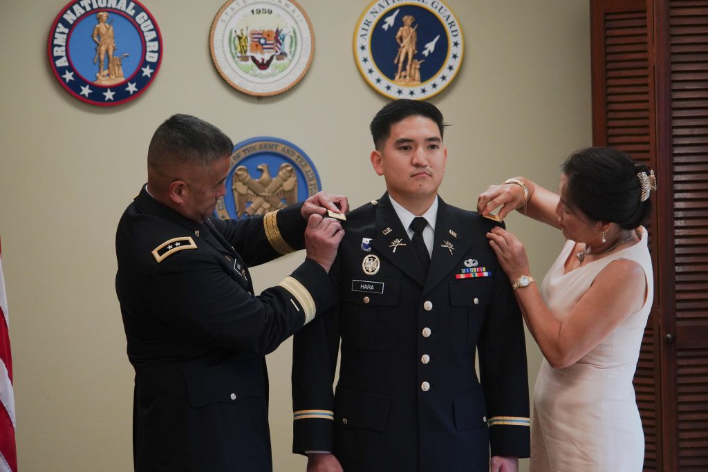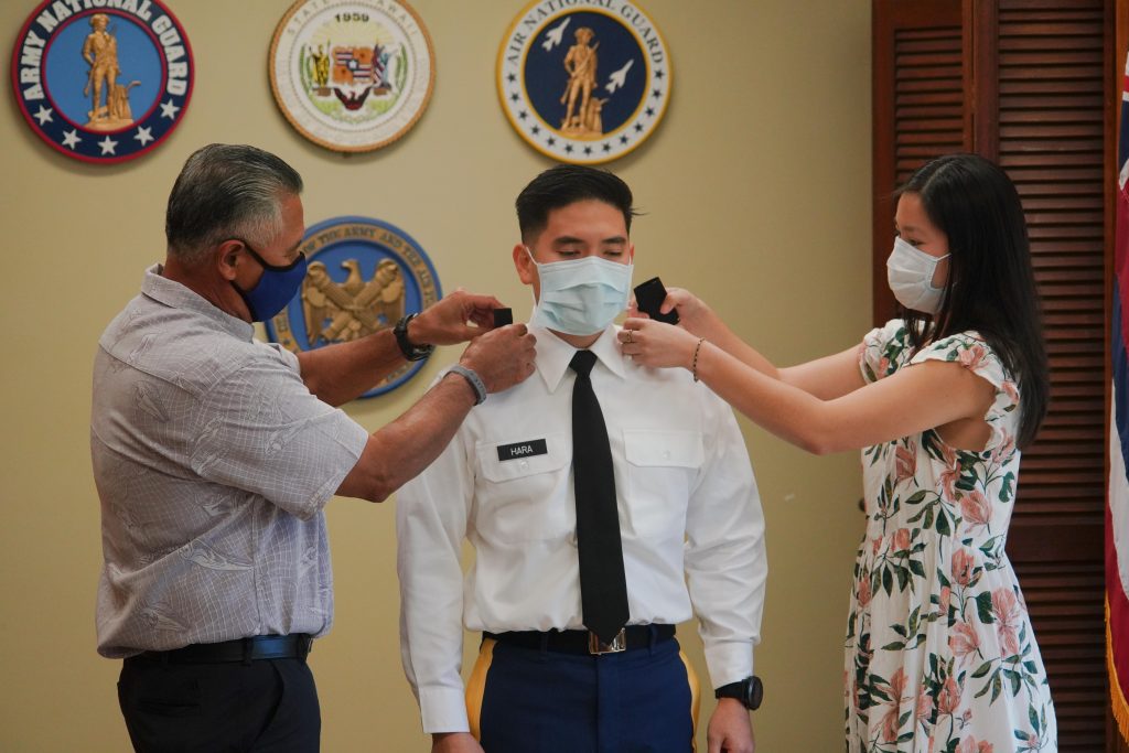 Maj Gen Kenneth Hara and his wife, Myong, pinned their son, Justin with his gold bars on May 15, 2020. The ceremony took place in the State Department of Defense conference room. Justin’s uncle, Maj Gen (Ret) Gary Hara and his sister, Alicia, pinned his should lapel shoulder taps. Justin’s uncle, CSM (Ret) Dennis Hara rendered the first salute – via the internet from Hilo.