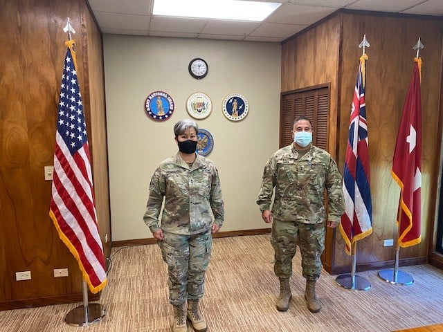 Maj. Gen. Kenneth S. Hara, Hawaii’s Adjutant General, received the Defense Superior Service Medal yesterday in a very small, socially distanced, ceremony. The medal was presented by Maj. Gen. Suzanne Vares-Lum, Mobilization Assistant to the Commander, U.S. Indo-Pacific Command (USINDOPACOM) and a good friend of General Hara. The award period was for actions between October of 2015 to December of 2019.