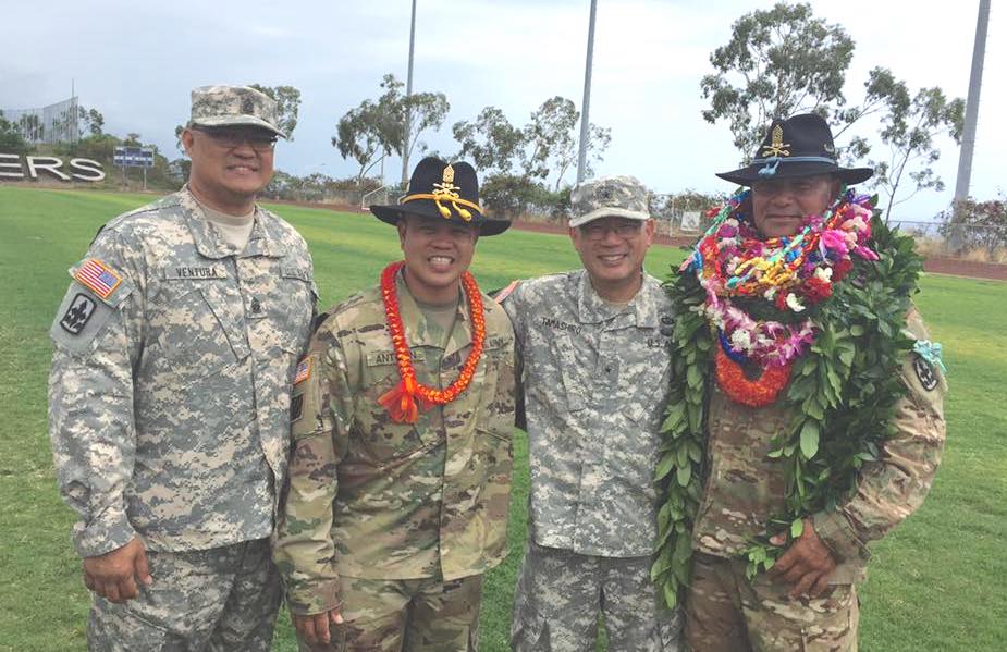 In the photograph, CSM Leonard Ventura, CSM Shon Antolin, BG Keith Tamashiro and CSM Craig Ynigues take moment together after the Change of Responsibility ceremony.