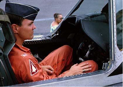 Big Daddy is seen in the cockpit with his orange flight suit. The Air Force later converted to the green suits. On the right shoulder of his flight suit is the 199th Fighter Interceptor Squadron “Deuce” patch.