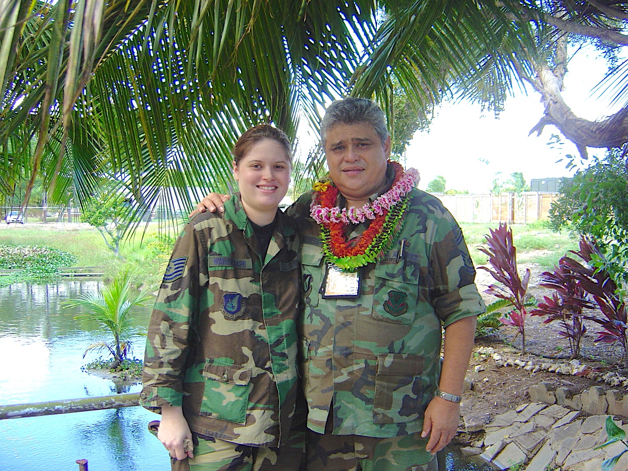 This undated photograph shows Dawn Wahinekapu and her father, John “Big John” Wahinekapu. We believe he retired December 2003. Big John retired as the Engine Shop chief. Dawn continues to serve with the 154th Medical Group as the senior technician. She was promoted to chief master sergeant several years ago.