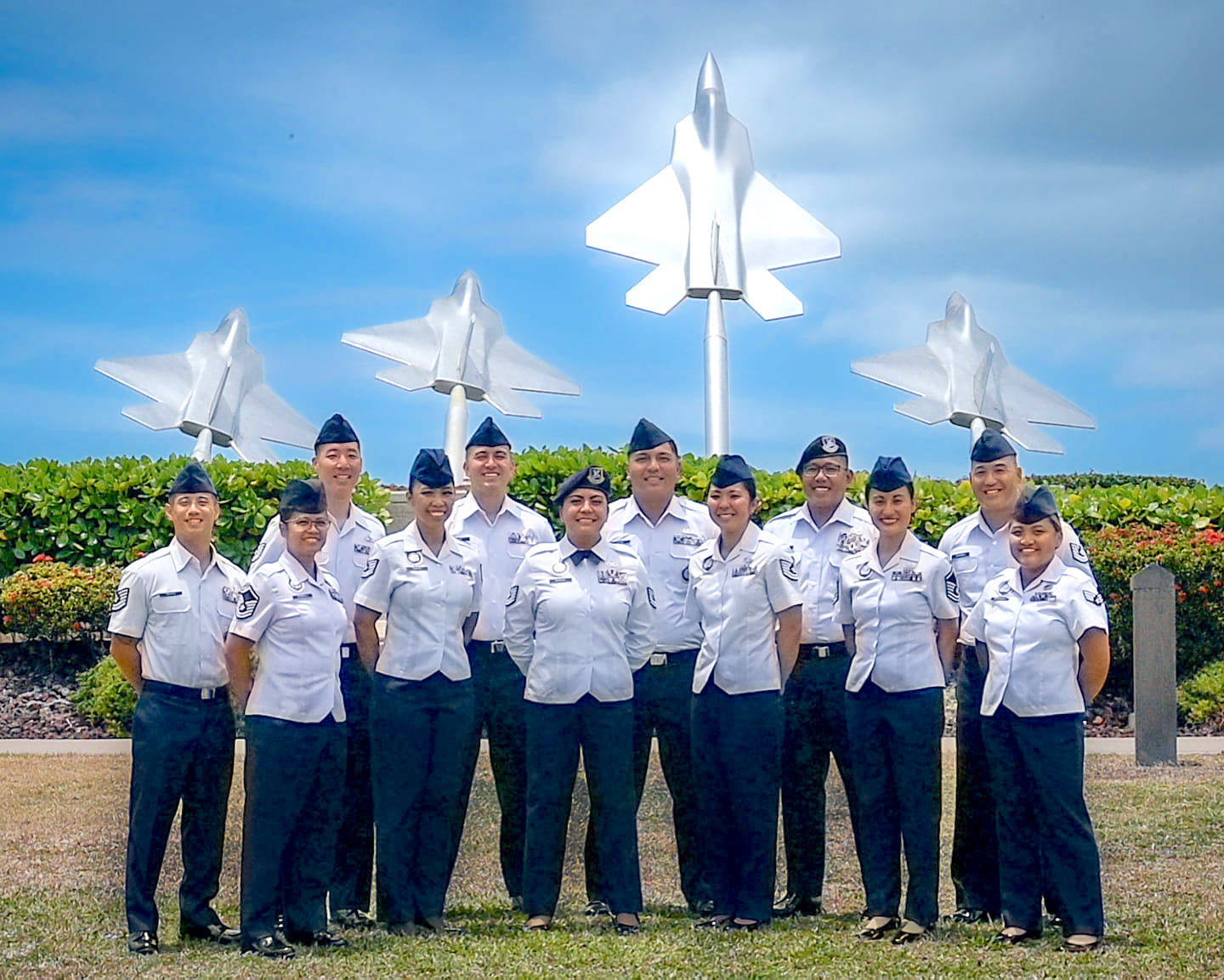 Front row (L-R): MSgt Leslee Siongco, TSgt Sharon Pasion, TSgt Louisa Waikiki, TSgt Kodie Nakamoto, MSgt Marigold Manalo, SrA Breyhanna Magusara