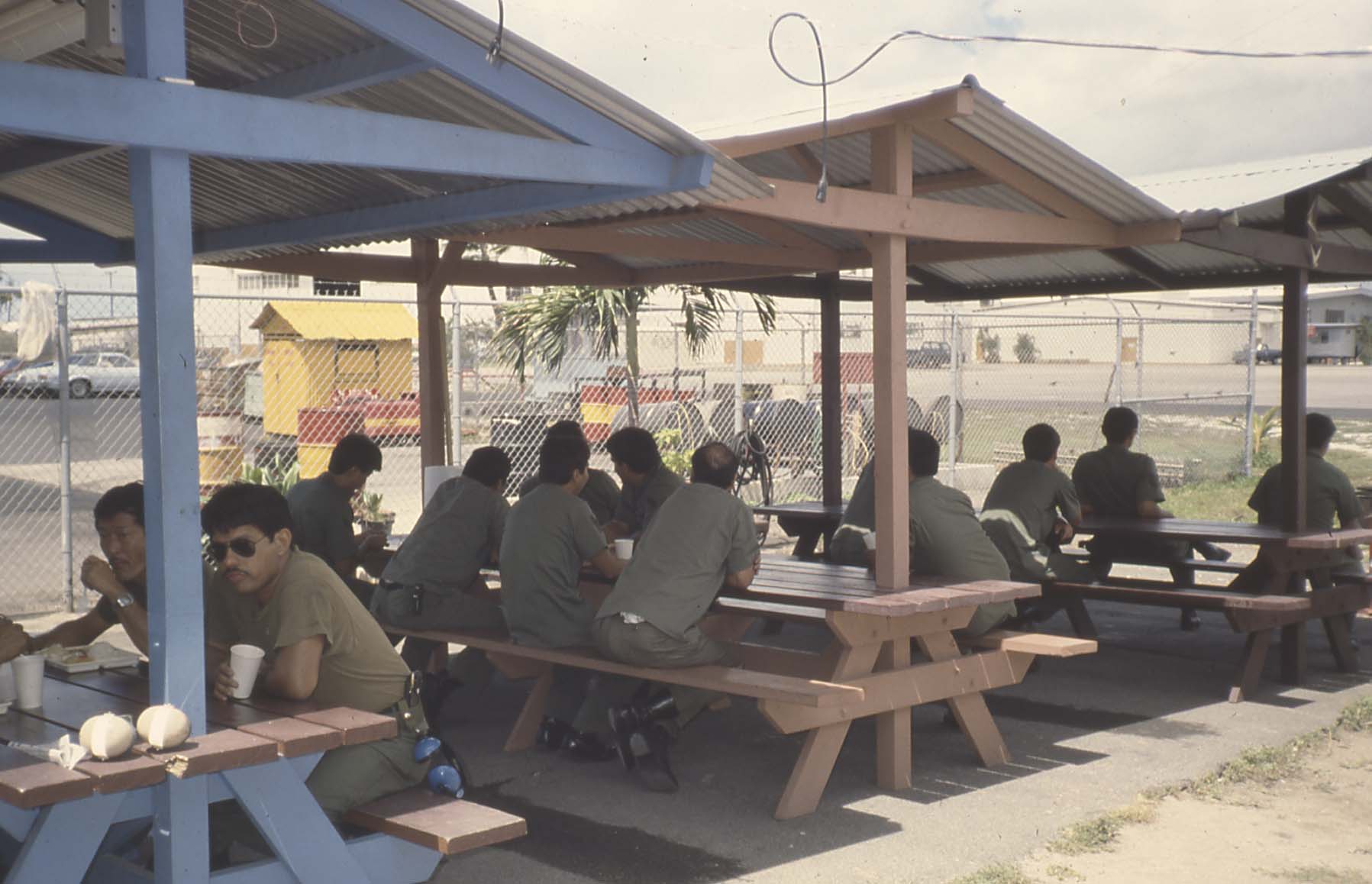 This undated photograph show Organizational Maintenance members eating lunch near the flightline. The dining hall back then was on the second floor on the ocean side of the fighter hanger (Building 3400. Seating was extremely limited. Many members picked up their lunches and returned to their work areas to eat. Rainy days were challenging